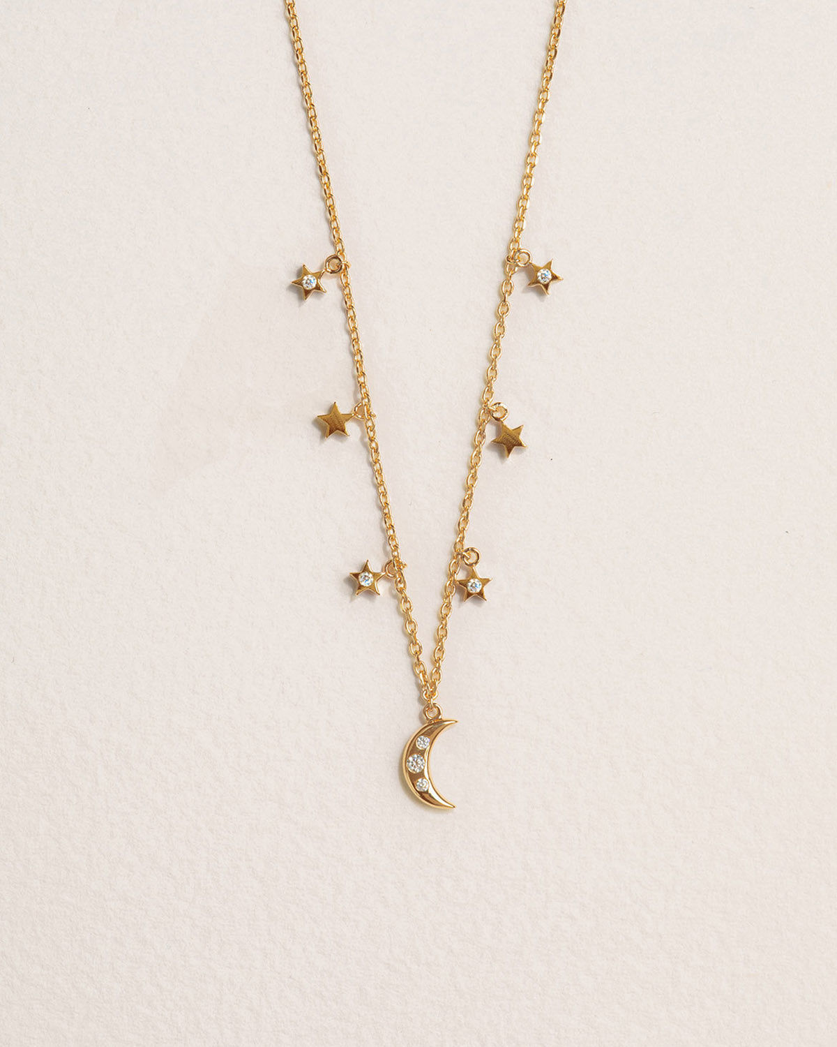Un delicado collar donde una media luna y pequeñas estrellas danzan a lo largo de una fina cadena dorada, evocando noches llenas de estrellas.